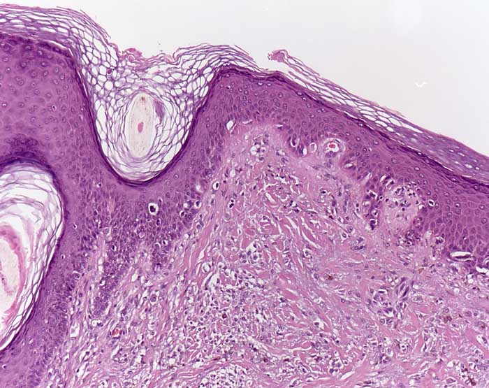 Lentiginöse Hyperplasie atypischer Melanozyten entlang der Junktionszone entsprechend einer Lentigo maligna. Die angrenzende Dermis ist narbenartig fibrosiert und ist auffallend zellreich (desmoplastisches Melanom). Die dermalen Zellen weisen lediglich geringe Atypien auf.