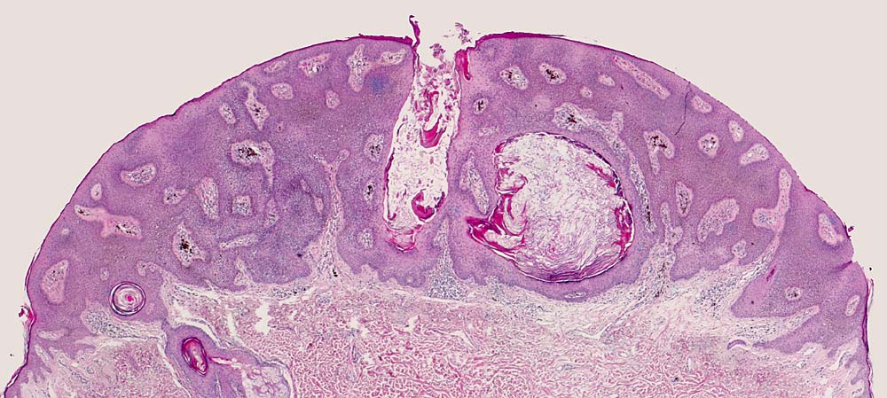 Akanthotische seborrhoische Warze mit ausgeprägter Pigmentierung. Melanophagen in der papillären Dermis. Keratingefüllte Epidermisinvagination und Hornzysten.