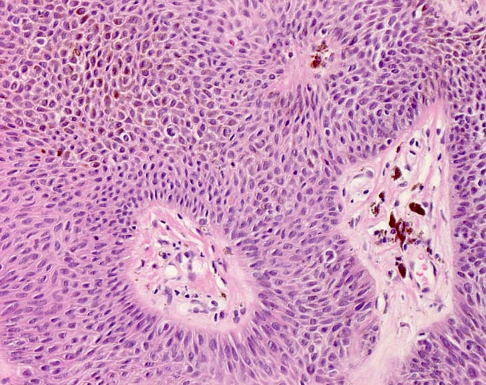 Intraepidermale Proliferation monomorpher zytoplasmaarmer basaloider Tumorzellen. Zahlreiche Tumorzellen sind kräftig pigmentiert. Melanophagen in der papillären Dermis.