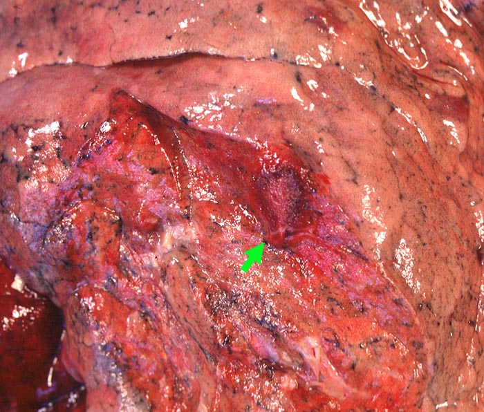► Hämorrhagischer pneumonischer Herd bei Aspergilluspneumonie.