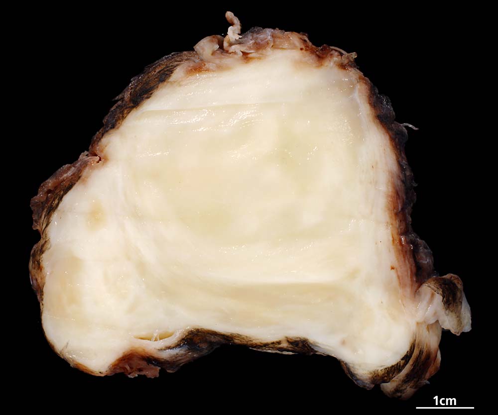 Solider Tumor mit gelb-beiger, stark glänzender Schnittfläche.