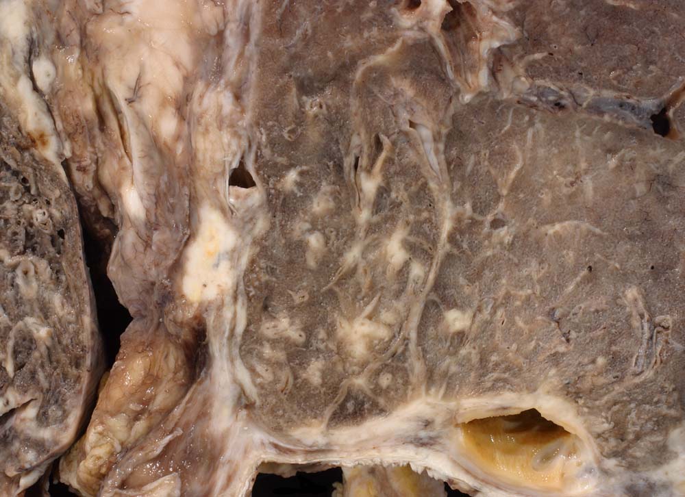 Metastatisches Tumorgewebe mediastinal und schwere Lymphangiosis carcinomatosa mit Hervortreten der verdickten karzinominfiltrierten Lymphgefässe, die um die Arterien angeordnet sind.