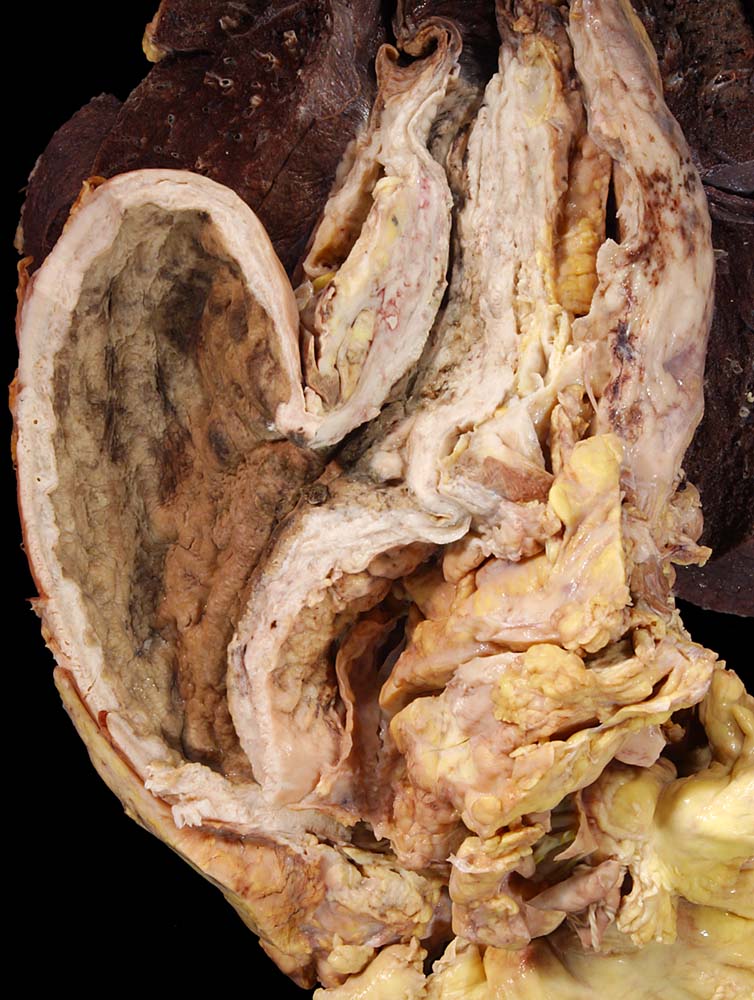 Ungewöhnlich ausgedehntes Karzinom. Die Wand von Ösophagus und Magen sind diffus verdickt durch Tumorinfiltration. Ausbreitung per continuitatem auf die linke Lunge und auf das peripankreatische Fettgewebe.