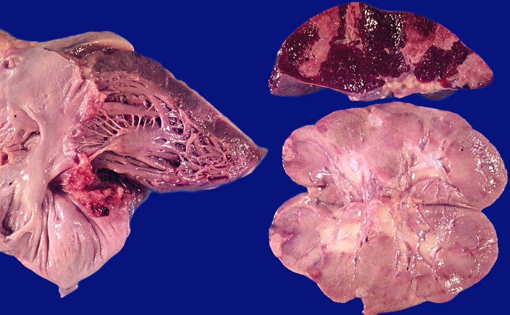 Frische Klappenvegetationen auf der Mitralklappe. Ausgehend von der Klappenvegetation Embolien im grossen Kreislauf mit frischen anämischen Infarkten der Niere und der Milz.
