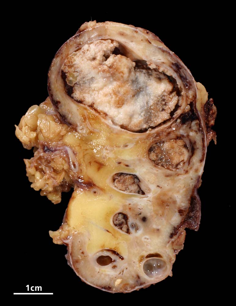 Das Nierenbeckenkelchsystem ist ausgeweitet und angefüllt mit papillären Tumormassen, die kein invasives Wachstum zeigen. Rindenatrophie und Vakatfettwucherung.