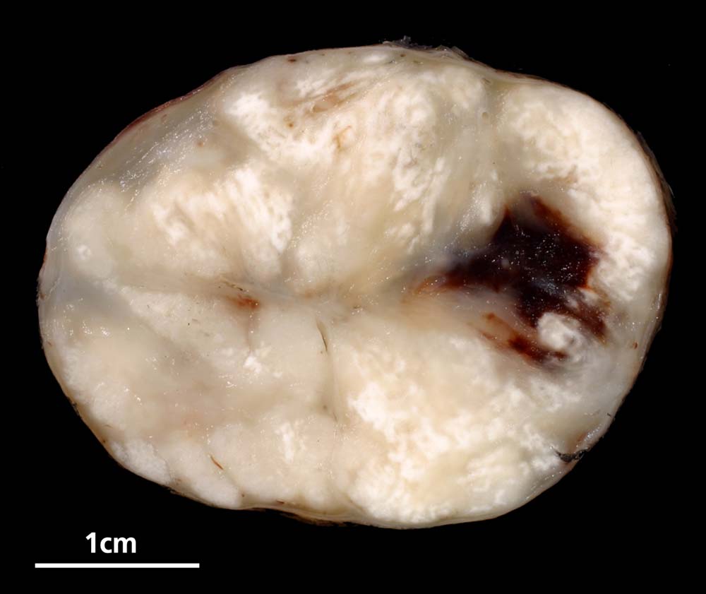 Bekapselter 5 cm messender weissgrauer Knoten mit myxoid glänzenden und eingebluteten Arealen.