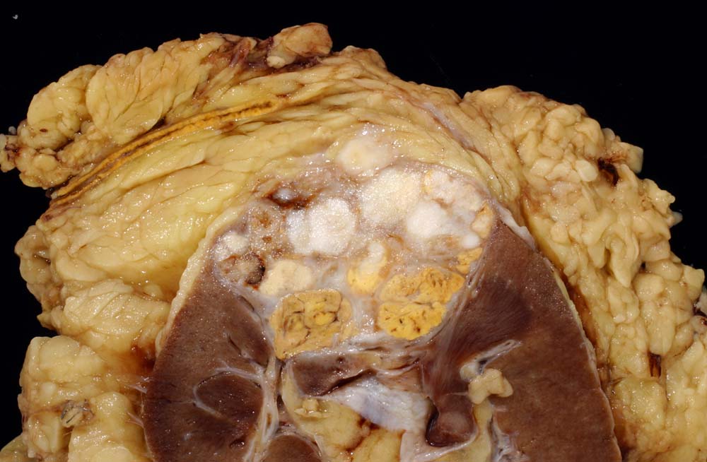 Im Oberpol findet sich ein maximal 4.6 cm durchmessender Tumor mit knotig gelber, teils sklerotisch weiss glasiger Schnittfläche (bunte Schnittfläche des klarzelligen Karzinoms). Die Nierenkapsel ist im Polbereich durchbrochen. Im perirenalen Fettgewebe ist ein Anschnitt der tumorfreien Nebenniere erkennbar.