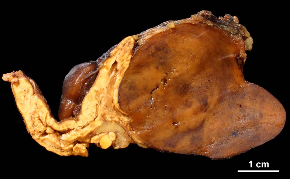 Scharf begrenzter solider rehbrauner Tumor mit matter Schnittfläche ausgehend von der Nebenniere.