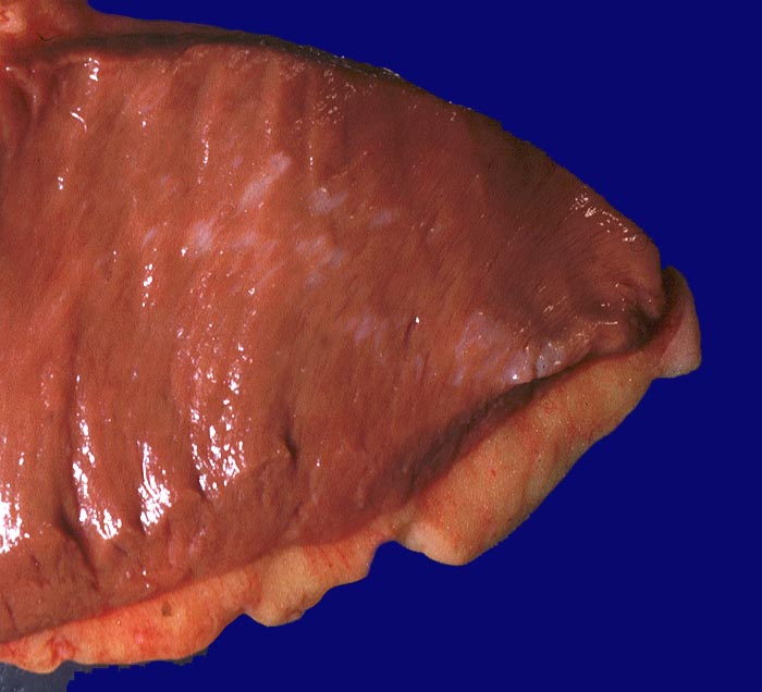 Kleine weisse Narben in der Parenchymschnittfläche der Vorderwand.
