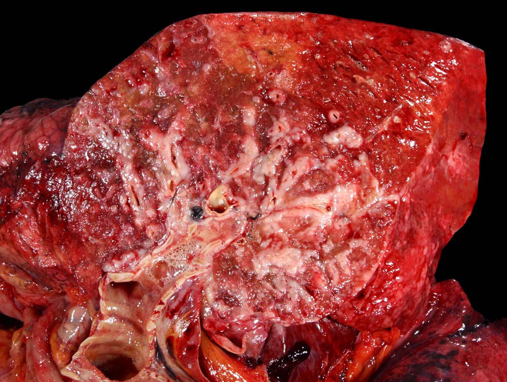Strassenförmige tumoröse Verdickungen entlang der pulmonalen Lymphgefässe parallel zum Verlauf der Bronchen. Das Lungengewebe erscheint verdichtet (Pneumonische Infiltrate).