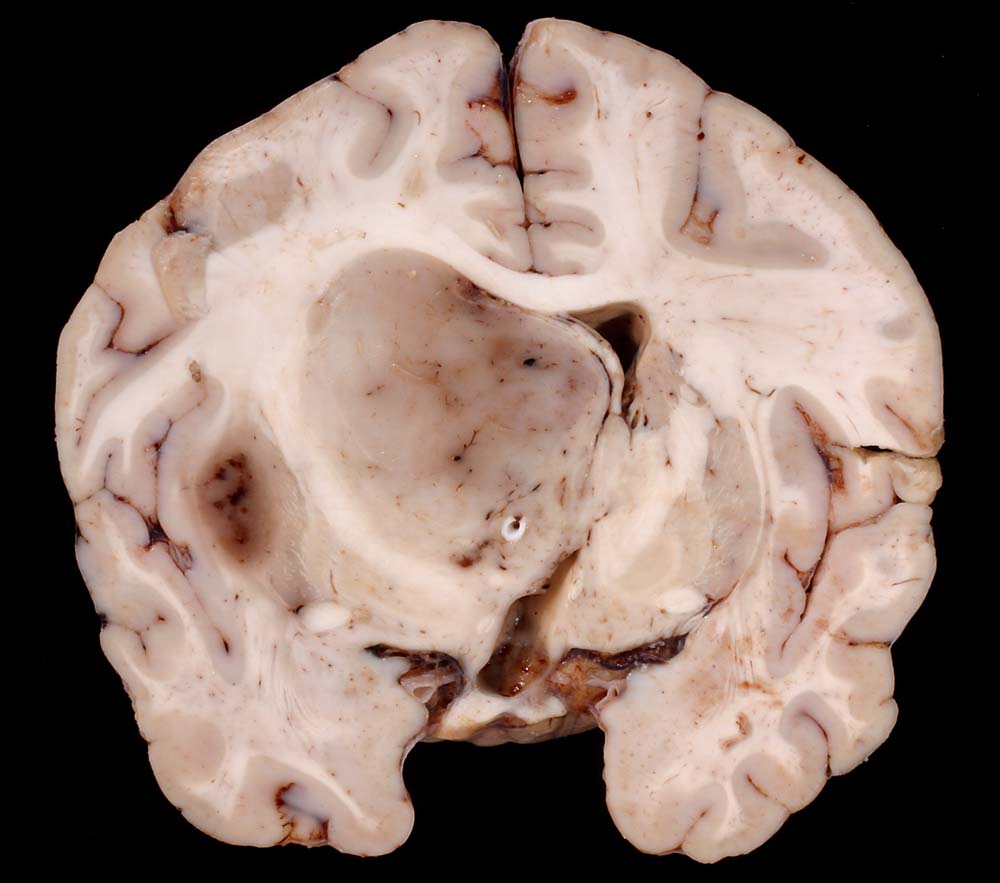 Gräuliches Tumorgewebe verschiebt die Mittellinie stark zur Gegenseite und komprimiert den Seitenventrikel.