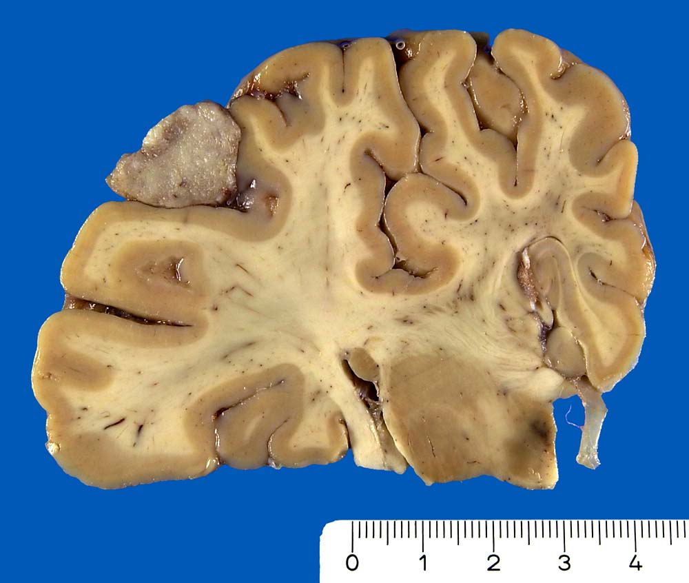 Der parietalen Hirnrinde anliegender kugeliger grauer Tumorknoten.