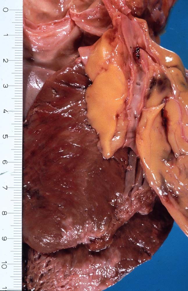 An der Bifurkation des RIVA/Ramus diagonalis ist das Lumen des RIVA thrombosiert. Auf der Schnittfläche der Vorderwand ist eine Infarktnarbe und eine fleckige Verfärbung des Myokards (akuter Myokardinfarkt) erkennbar.