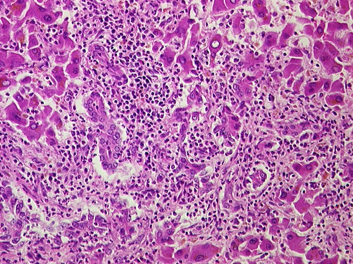 Portalfeld in der unteren Bildhälfte mit dichtem granulozytärem Entzündungsinfiltrat, welches auf die Gallengänge übergreift.
