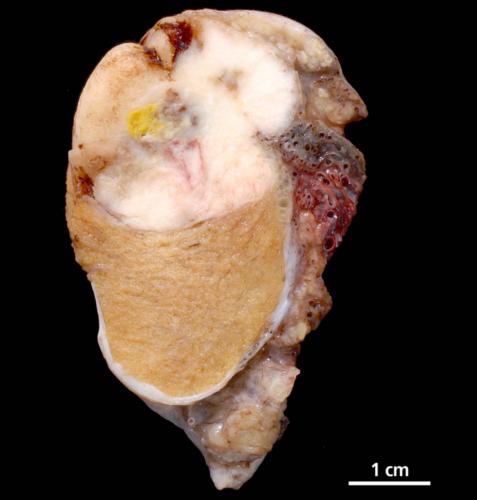Im Bereich des Hodenoberpols findet sich ein braun-weisser, lobulierter, zentral herdförmig gelb-brauner Tumor. Der Tumor infiltriert das Mediastinum testis ohne Infiltration vom Nebenhoden. Restparenchym ockerbraun.