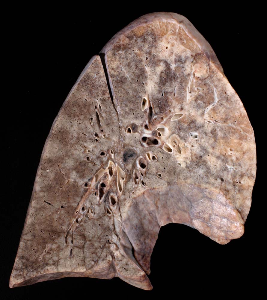 Konsistenzvermehrtes Lungenparenchym mit zahlreichen fleckförmigen Infiltraten.