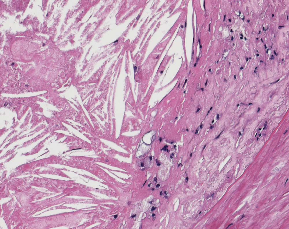 Bildausschnitt aus einem Atherom bestehend aus teils zerfallenen Schaumzellen und wetzsteinförmigen herausgelösten Cholesterinkristallen.
