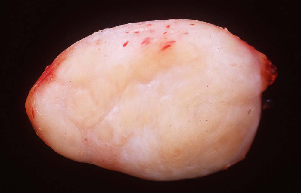 Vergrösserter (2.7cm Dm) stark fibrosierter gelbweisser Lymphknoten durchzogen von breiten Bindegewebssepten.