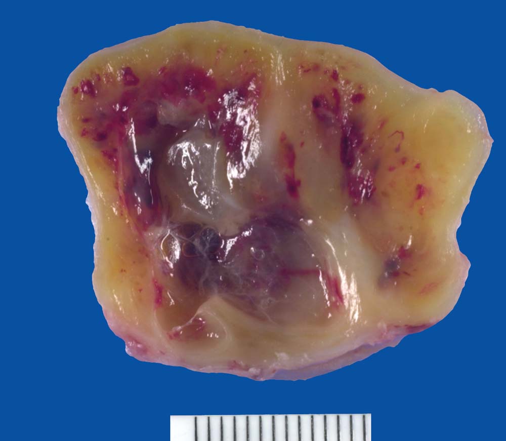 Grau-gelbliche, von bindegewebigen Septen durchzogene Schnittfläche. Herdförmig hämorrhagische Areale und glattwandige Zysten. Die Schnittfläche wirkt etwas myxoid.