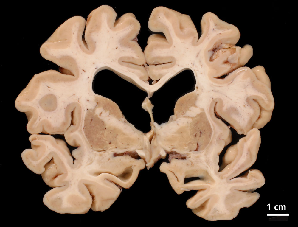 Die Grosshirnhemisphären stellen sich symmetrisch dar und zeigen eine ausgeprägte kortikale Atrophie.