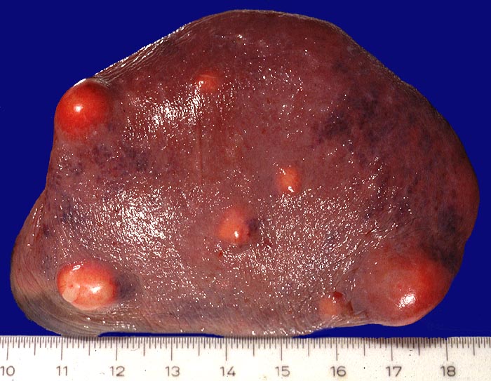 Multiple runde Metastasen wölben die Milzkapsel vor.