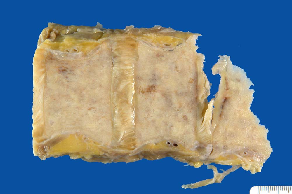 Die Wirbelkörper erscheinen sehr kompakt und sind diffus weiss verfärbt durch die Karzinominfiltrate.