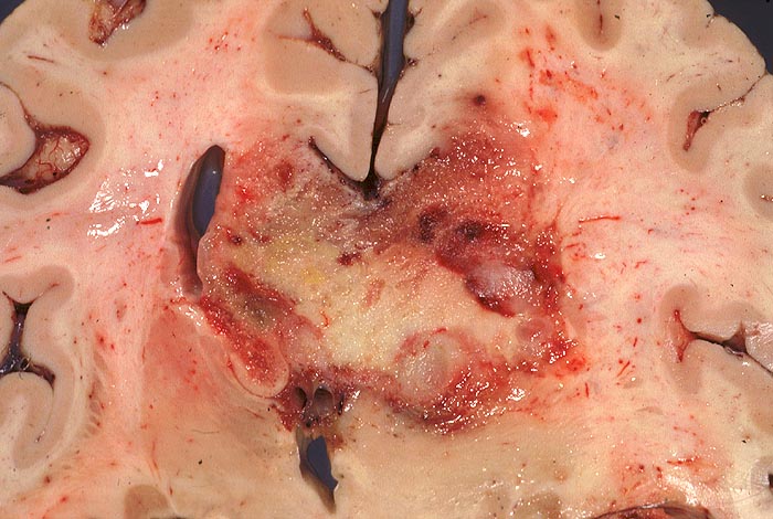 Bunter unscharf begrenzter schmetterlingsförmiger Tumor. Der Tumor überschreitet die Mittellinie im Bereich des Balkens und infiltriert beide Hemisphären. Intraventrikuläre Tumorausbreitung rechts.