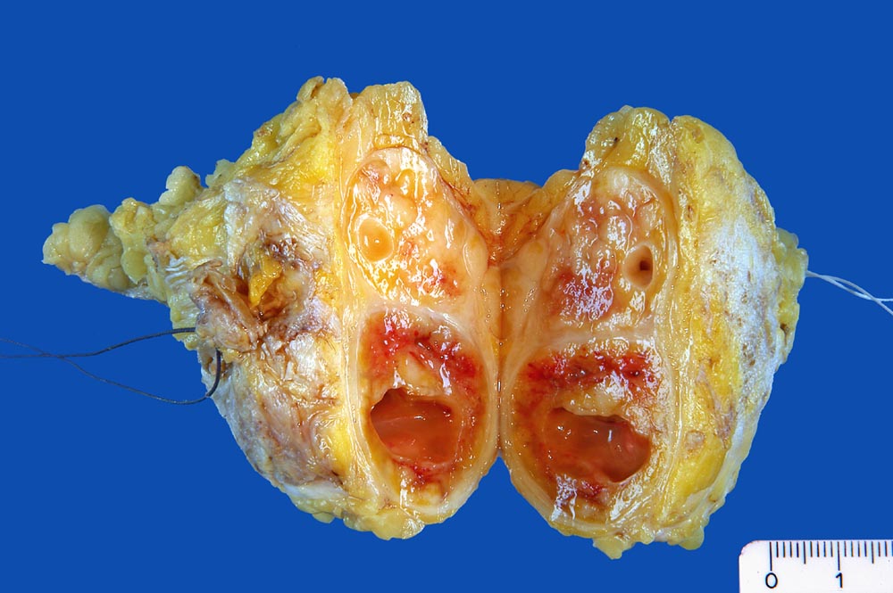 7.5 x 5 x 2.7cm messender, teils zystischer, teils gelblich weisslich, derber Tumor. Der Tumor erscheint allseits umkapselt.