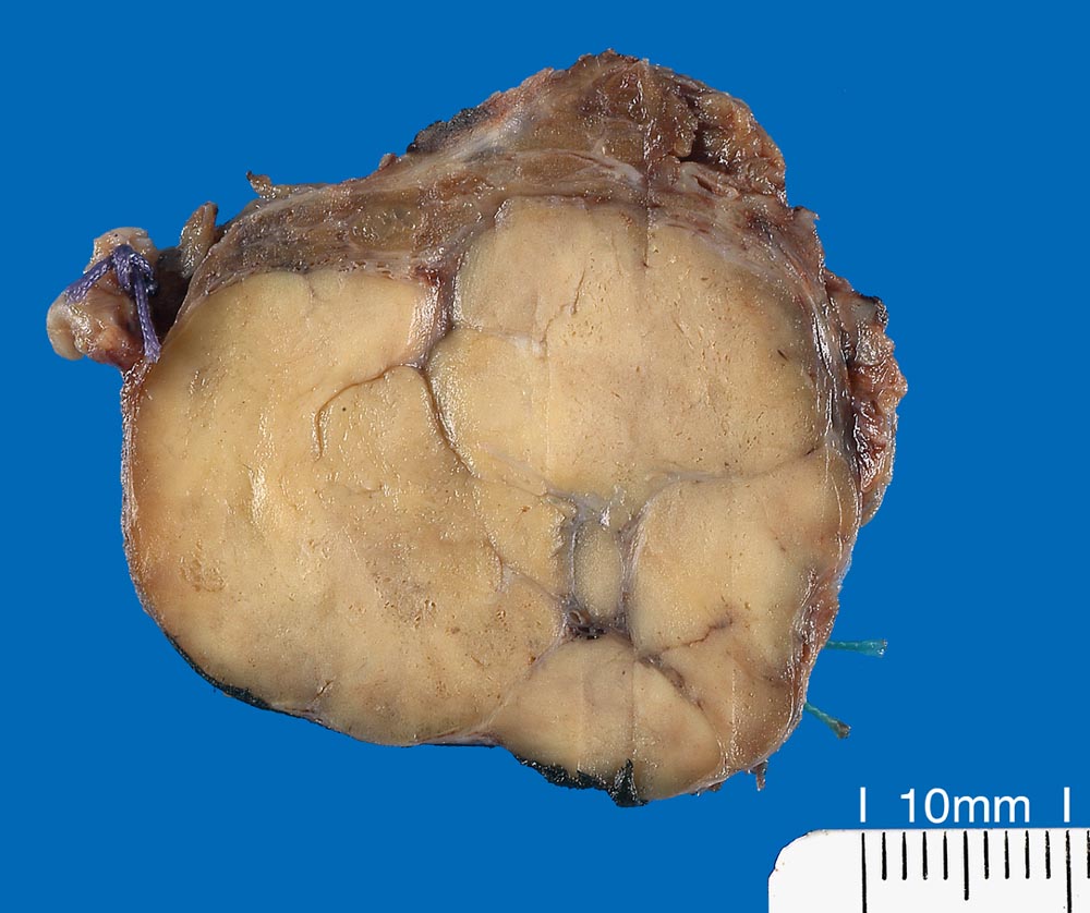 Multilobulierter beiger Schilddrüsentumor. Am Rand wenig dunkelbraune Restschilddrüse.