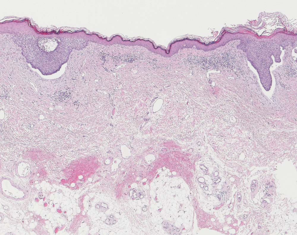Von der Epidermis ausgehende basaloide Zellnester mit peripherer Palisadierung und charakteristischem Retraktionsartefakt zwischen Tumorzellen und angrenzendem Stroma. Zwischen beiden Zellnestern ist die Haut tumorfrei.