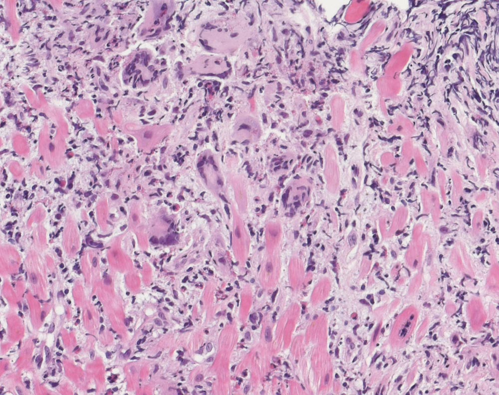 Innerhalb des Myokards findet man massenhaft Infiltrate von Lymphozyten, Histiozyten sowie zahlreichen eosinophilen Leukozyten. Dazwischen sind immer wieder einzelne Riesenzellen eingestreut, die teils myogenen Riesenzellen, teils Histiozyten entsprechen. Die Herzmuskulatur ist im Bereich der Infiltrate landkartenförmig zerstört. Die erhaltene Herzmuskulatur zeigt keine Auffälligkeiten.
