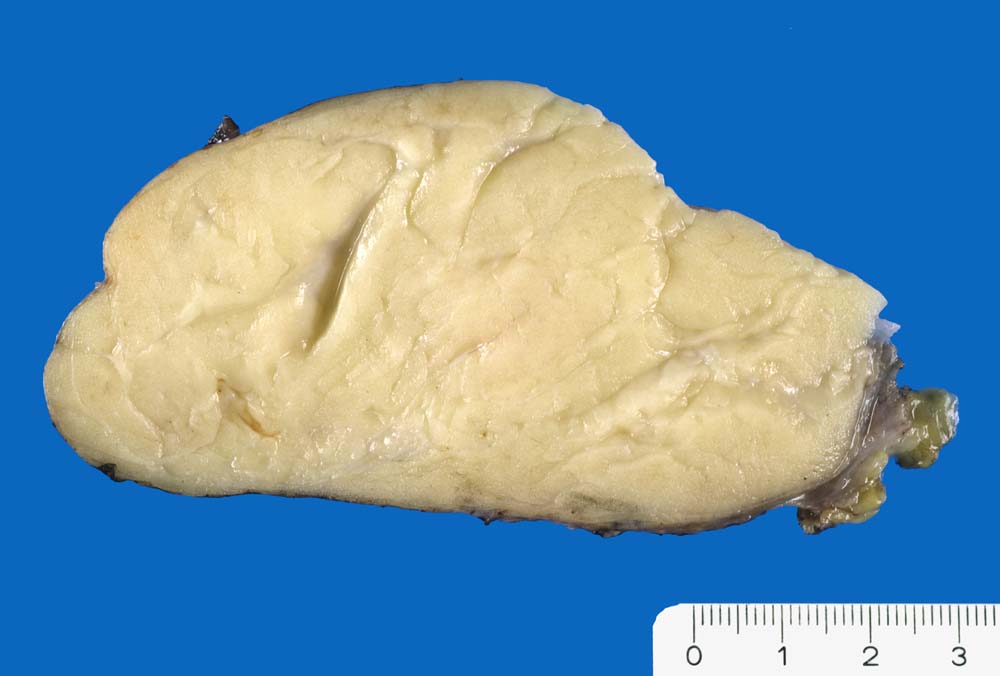 Auf Schnitt ein groblappiger hellgelber an Fettgewebe erinnernder Tumor. Vereinzelt feine weisse Bindegewebsstränge und zarte Gefässe zu erkennen. Der Tumor ist von einer Pseudokapsel umgeben und scharf begrenzt.