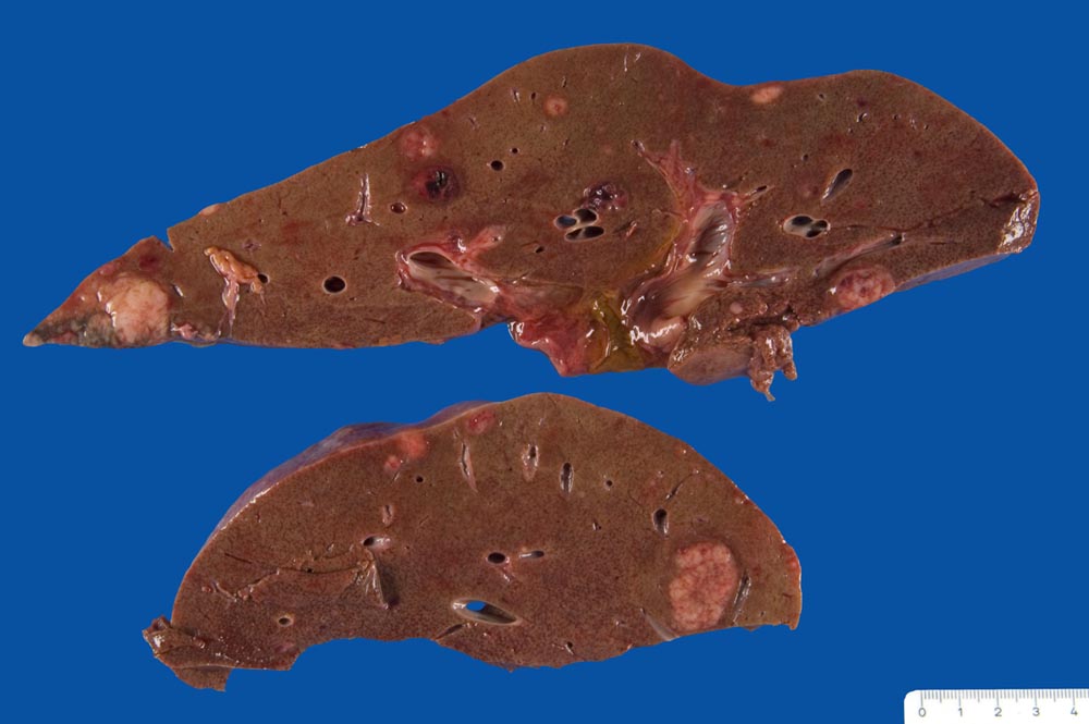 Multiple knotige, teils hämorrhagische Infiltrate des Plasmazellmyeloms in der Leber.