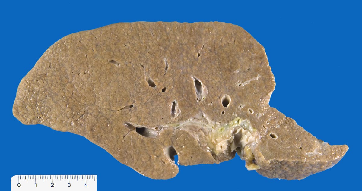 Verkleinerte Leber mit feinknotiger Zirrhose und gelblicher Schnittfläche (formalinfixiertes Gewebe)