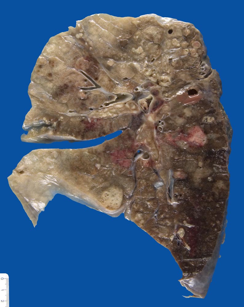 Auf dem Parenchymschnitt des linken Lungenlappens sind zahlreiche pneumonische Infiltrate und eine kleine Abszesshöhle erkennbar. Die Bronchen sind ausgefüllt mit Eiter.