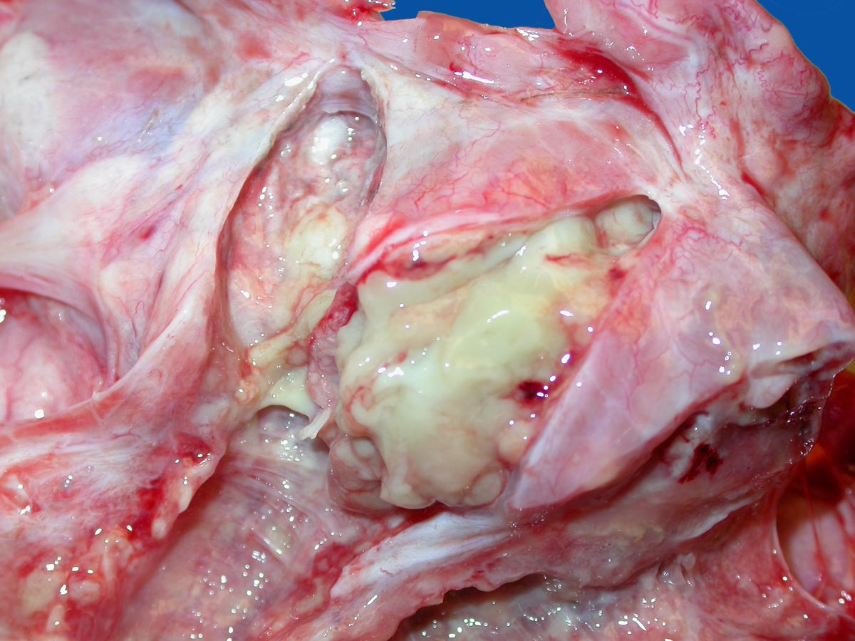 Bis in die Peripherie stark erweiterte Bronchien gefüllt mit grüngelbem dickflüssigem Eiter. Die Bronchien zeigen eine deutliche Querriffelung aufgrund der hyperplastischen Muskulatur der Bronchialwand. Die Pleura ist flächenhaft vernarbt.